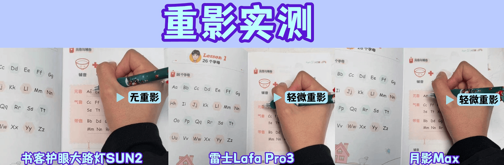 实测方法:我们将模拟读写场景,可以直观的看到每一款护眼大路灯是否存在重影。