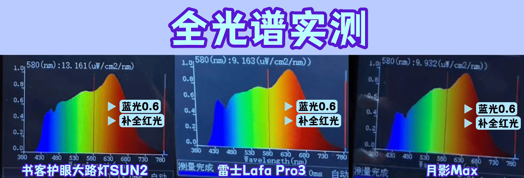 实测原因:全光谱是判断光线是否安全、是否真正护眼的重要维度。理想的全光谱应高度贴近太阳光,蓝光峰值受控、光谱连续性高,同时具备充足而均衡的红光成分,这样呈现出的光线更自然柔和,有助于减轻用眼负担。相反,蓝光偏高或光谱出现断层的光源,不仅与自然光差距明显,还可能增加视网膜刺激风险,长期使用不利于视力健康。
