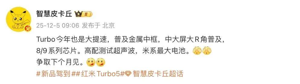同时,博主@智慧皮卡丘 也表示这款新机属于红米Turbo5系列。其将“两杯齐发”,且同期还有耳机,PC,桌充测试中。