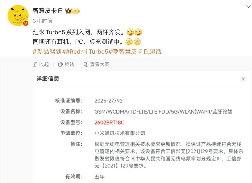 近日还有消息显示,一款型号为 2602BRT18C 的小米新机通过了无线电核准。其中没有详细的产品系列信息,相关推测认为其有可能是 REDMI Turbo 5 Pro。