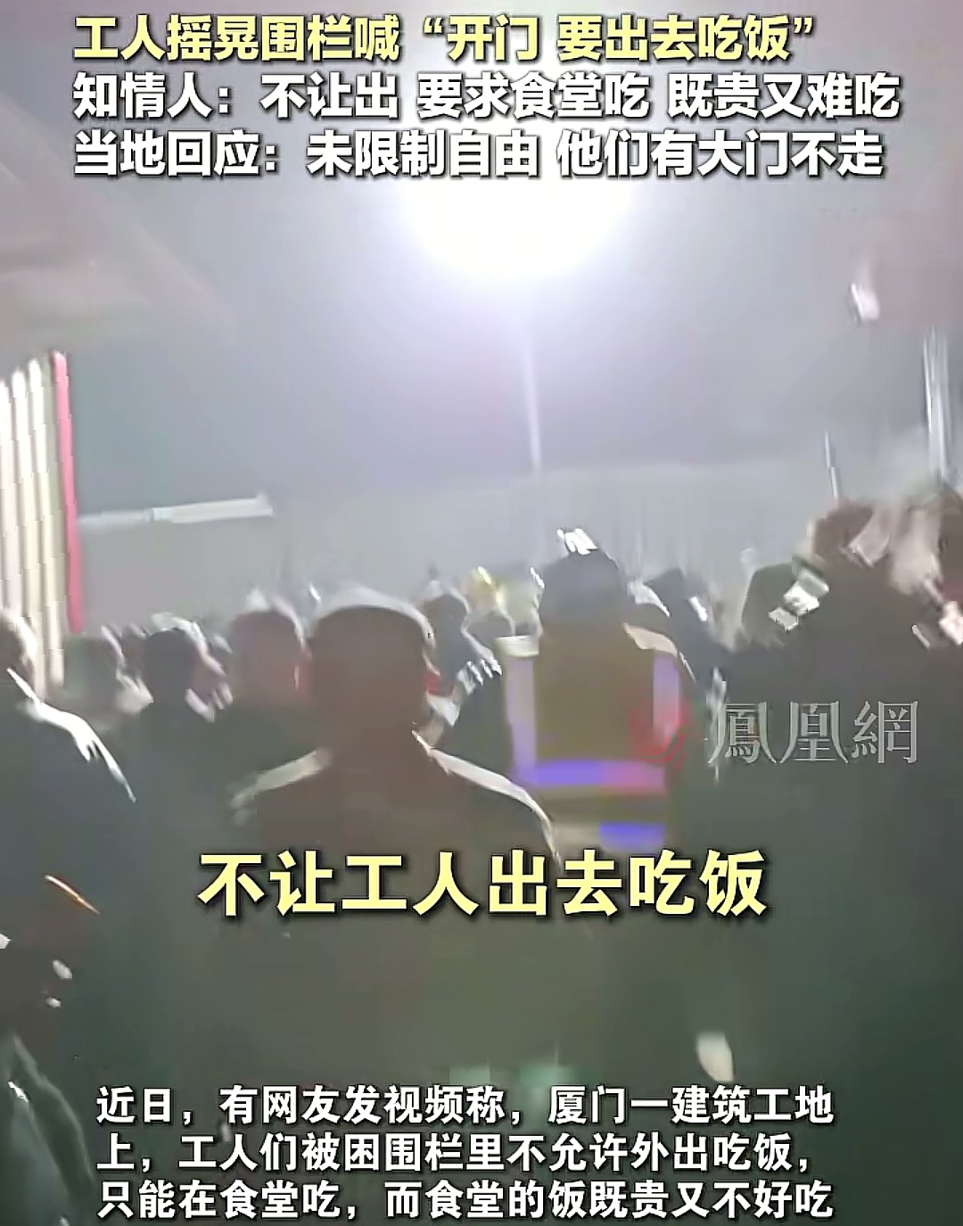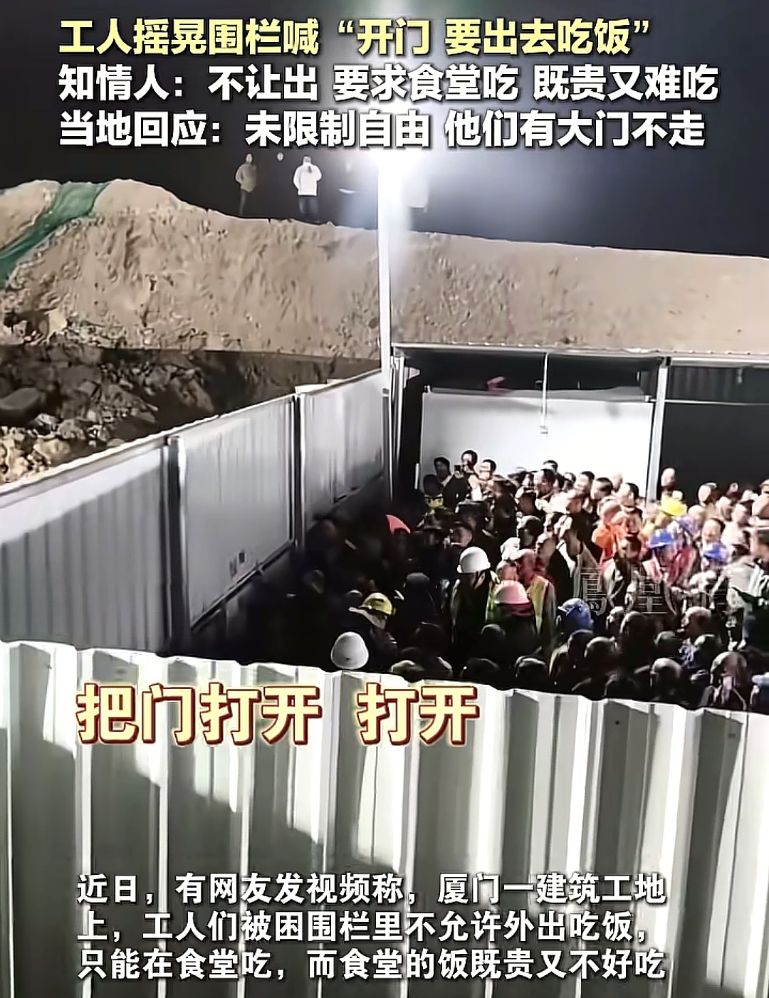 “我们要出去!我们要吃饭!” 近日,福建厦门一处建筑工地的视频在网上炸开了锅。画面里,几十名建筑工人围在一道封闭的铁门前,有人用力摇晃着铁门,有人高声呼喊,情绪激动。视频配文称 “中建一局工地限制工人外出吃饭,强制要求在食堂就餐”,这一幕让网友们直呼 “不敢相信”:“都 2026 年了,还能限制工人吃饭自由?”