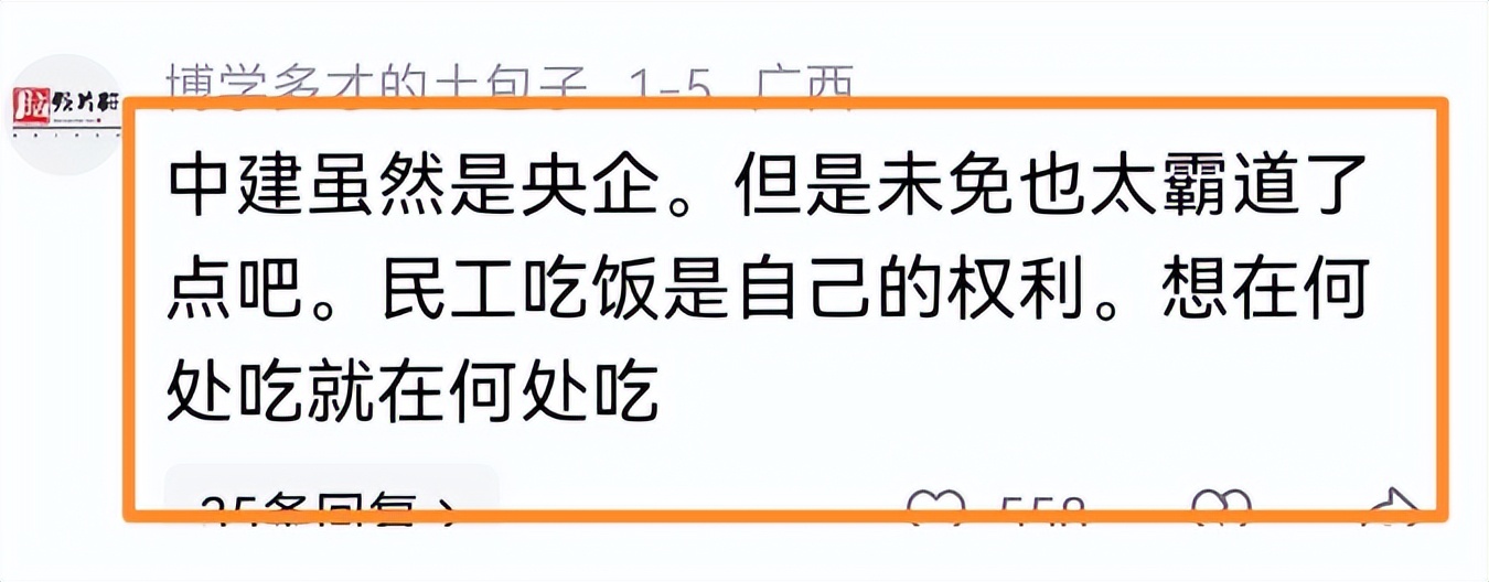 随着视频发酵,涉事工地 “中建一局” 被推上风口。网友们议论纷纷,不少人替工人鸣不平:“工人辛苦干活,连在哪儿吃饭都不能自己选?”“肯定是食堂饭菜又贵又难吃,不然谁愿意舍近求远出去吃?” 也有网友提出疑问:“央企工地管理应该很规范,会不会有什么误会?”