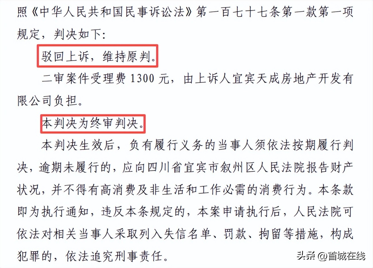 不服判决的天成房产向宜宾市中级人民法院上诉。2025年7月15日,宜宾市中级人民法院作出终审判决。《民事判决书》【(2025)川15民终866号】。宜宾市中级人民法院的终审判决其上诉进行了驳回,对一审判决进行了维持。