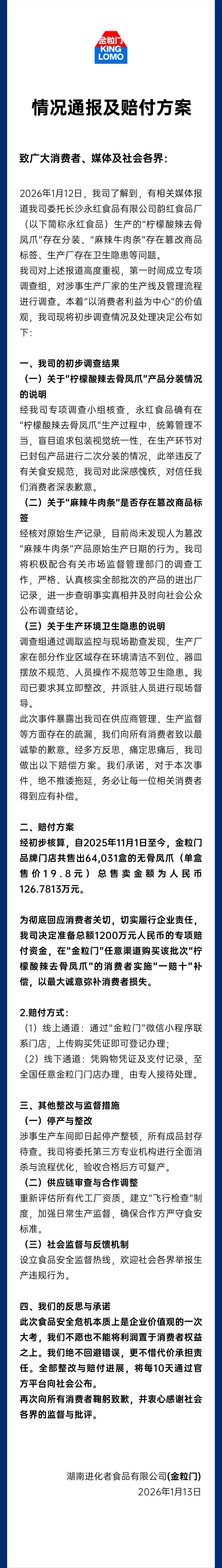 公司准备总额1200万元人民币的专项赔付资金,对在"金粒门"任意渠道购买该批次"柠檬酸辣去骨凤爪"的消费者实施"一赔十"补偿。此外,设立食品安全监督热线。
