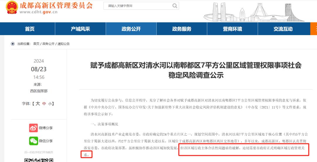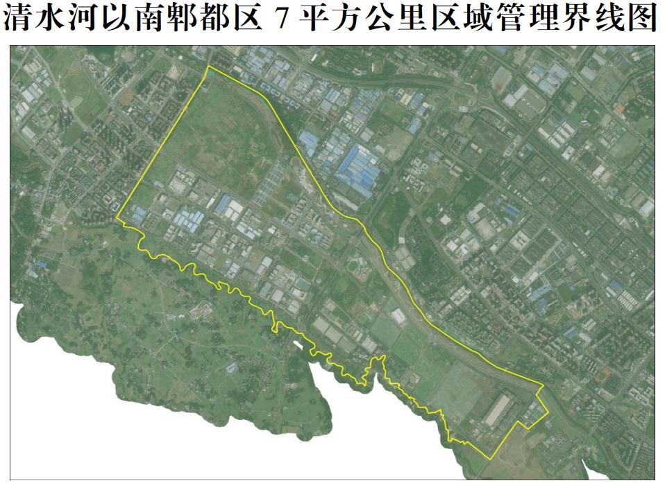 今年4月,成都市人民政府官网正式发布通知,将清水河以南郫都区德源街道辖区面积约7平方公里的区域交由成都高新区管理(范围如下)。这不是简单的“地盘划转”,而是一次精准的权限移交:规划、教育、科技、财政、土地、生态环境、市场监管等经济和社会管理权限,全部接入高新区的“高速网络”。