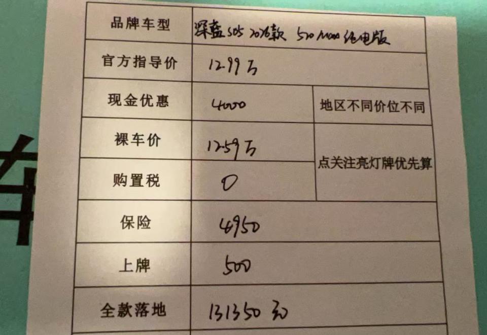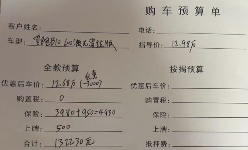 从4S店销售给的报价单来看,零跑B10 2025款 600激光雷达版(指导价12.98万),除去3000元的无门槛现金优惠,加上保险费用、上牌费用,全款落地价格在13.22万,一款顶配车型这个价格,品价比确实拉满了。