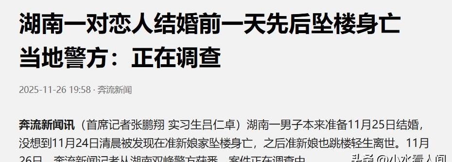 本来还在筹备婚礼的两家人,在11月24日却彻底被意外击垮了。当天清晨,一对原本打算次日在邵东市办婚礼的年轻恋人在双峰县女方家先后坠楼去世。事情很快就在当地炸开了锅,朋友圈里、微信群里都在讨论:这到底发生了啥?闹得家家户户不敢相信,也没人能真正说清里面的细节。