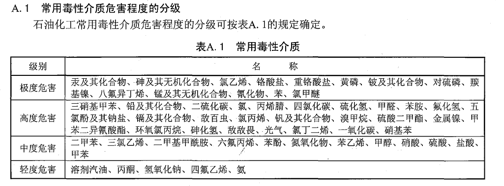 A1类:在本规范内系指剧毒流体,在输送过程中如有极少量的流体泄漏到环境中,被人吸入或与人体接触时,能造成严重中毒,脱离接触后,不能治愈。相当于现行国家标准《职业性接触毒物危害程度分级》GB5044中I级(极度危害)的毒物。