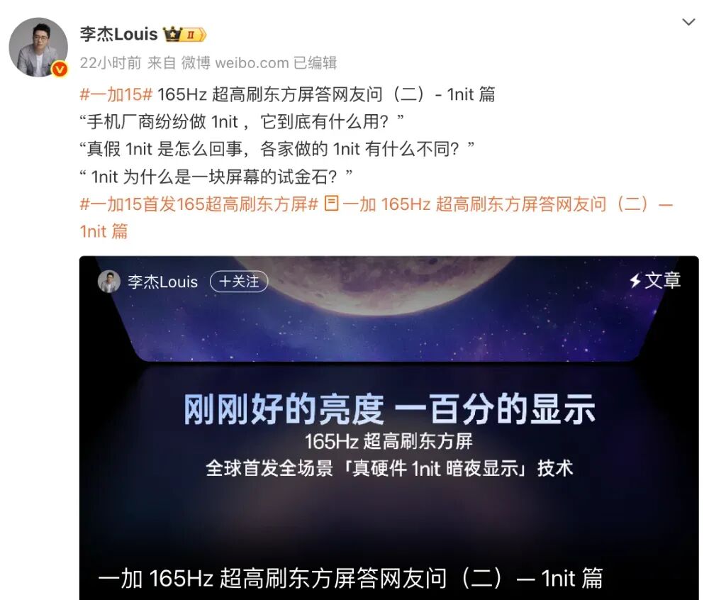 除了外观设计升级,一加中国区总裁李杰还在今天对一加15 165Hz 超高刷东方屏的“1nit”特性进行了相关介绍。