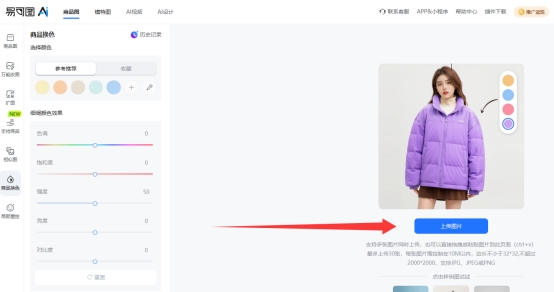 易可图在商品图颜色处理方面,主要依托 AI 商品换色功能,非常适合制作颜色 SKU 图。
