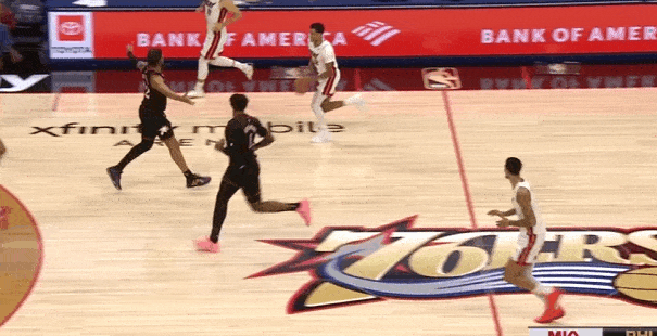早期进攻接哈克斯传球与丰泰奇奥发动边路手递手配合,接丰泰奇奥高吊传球高高跃起双手空接砸扣。