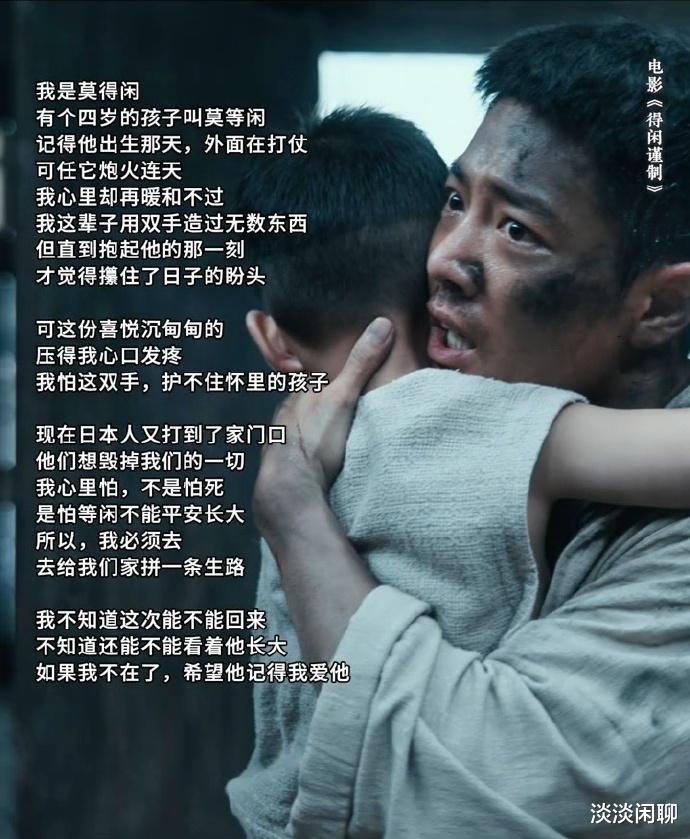 我们在不到20秒的宣传片里,看到一个为了家人拼了命,迸发出莫大勇气与智慧的汉子,那双悲愤又坚毅的眼睛,让人一秒入戏,走进了那段时光。不得不说,莫得闲全无肖战踪影,却一秒抓人眼球。这是一部沉寂了十年的电影,是一个关于抗战中的小人物的故事,怕是没有震撼的大场面来加成,却另辟蹊径以小人物展现保家卫国的止战精神,人物的刻画将会更见细致,也更加考验演员的资质与功力。