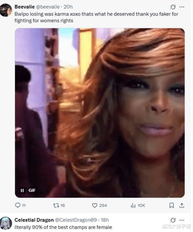这一举动原本只是普通的战术选择,却意外引发了一场关于“性别歧视”的舆论争议,事情的起因是,一位外网知名女Coser“Jas”在推特上发文质疑FLY:“为什么只Ban女英雄?不对劲!”她的言下之意很明显,怀疑FLY在BP时的选择带有性别歧视的意味。