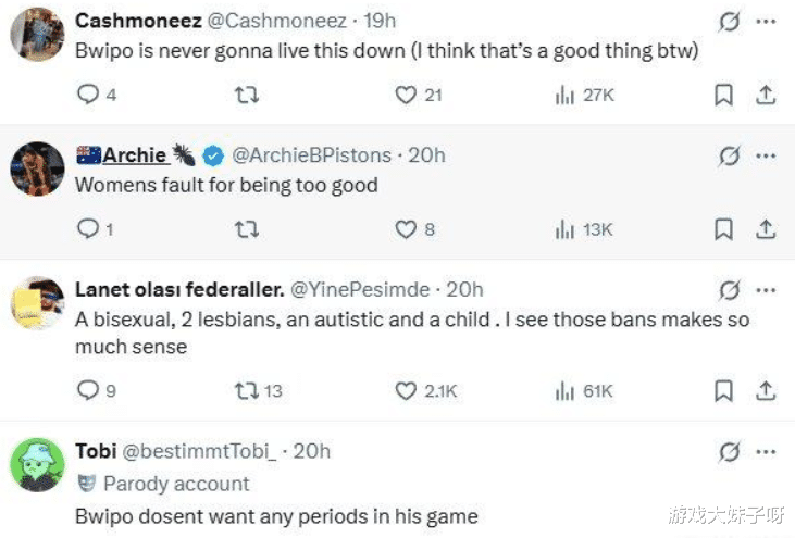帖子一经发布,很快就在社交媒体上炸开了锅,网友们纷纷围观、留言、争论,甚至引发了中外网友的二次讨论,巧合的是,FLY上单Bwipo曾经因为“女性有生理期不适合电竞”的言论而饱受争议,这让整件事更加敏感。
