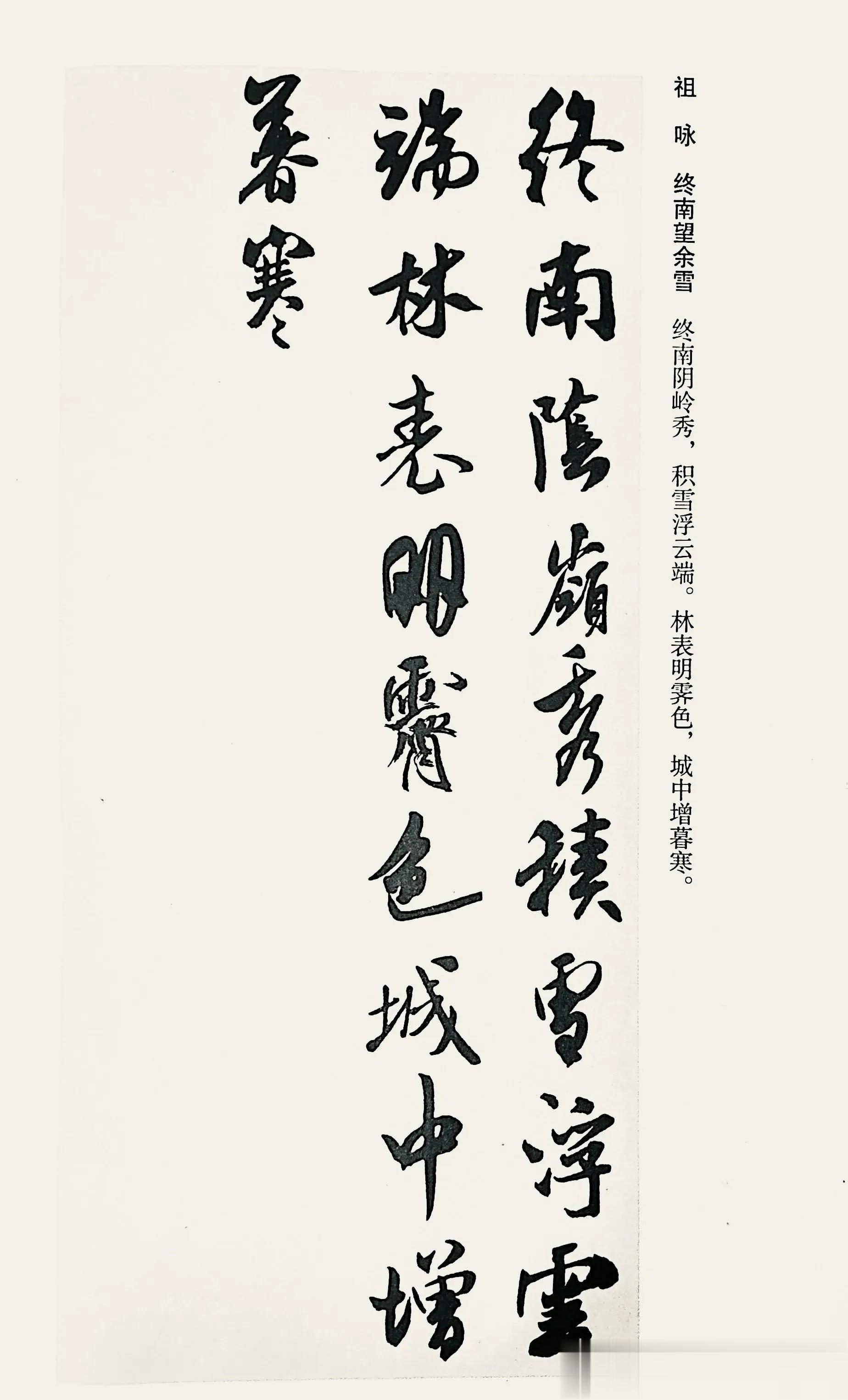 这是一首应试诗。《唐诗纪事》记载,祖咏年轻时去长安应考,文题是“终南望馀雪”,必须写出一首六韵十二句的五言长律。祖咏看完后思考了一下,写出了四句就搁笔了。他感到这四句已经表达完整,若按照考官要求写成六韵十二句的五言体,则有画蛇添足的感觉。当考官让他重写时,他还是坚持了自己的看法,考官再次端详他的诗作,被其中的凝练意境和人文关怀所打动。最终,予以录取。