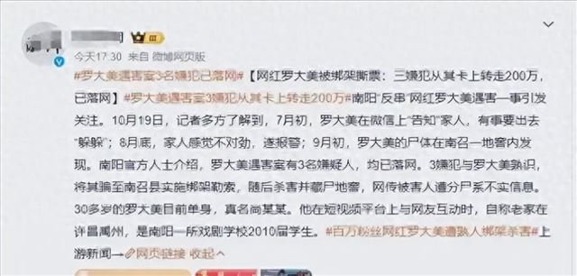 2023年7月的某个深夜,河南某地窖中发现的一具遗体,将"罗大美遇害案"推上热搜榜首。这位坐拥百万粉丝的反串网红,银行卡里200万元被熟人洗劫一空后惨遭杀害的遭遇,像一柄锋利的手术刀,划开了互联网时代最血腥的生存法则。当我们凝视这个由流量、财富与人性交织的黑暗漩涡时,是否也该反思:在数字化的狂欢中,我们究竟为自己打造了怎样的生存困局?