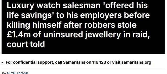他将自己的积蓄1.4万英镑,全都转到珠宝店的账上,然后自杀身亡了。