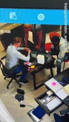与此同时,浅色衣服的劫匪B赶紧去抢手表。