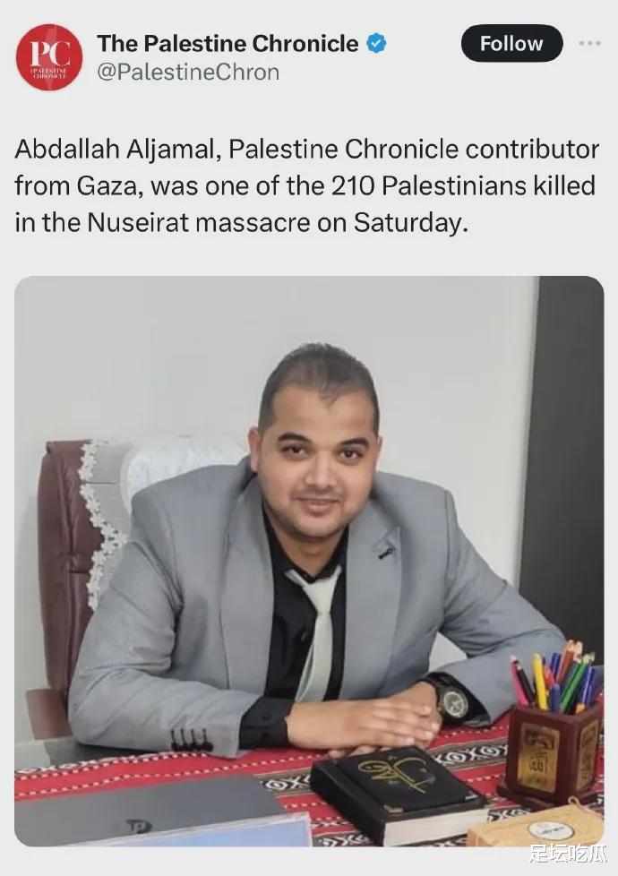 “来自加沙的《巴勒斯坦纪事报》撰稿人阿卜杜拉·阿尔贾马尔(Abdallah Aljamal)是星期六努塞拉特大屠杀中遇难的210名巴勒斯坦人之一。”