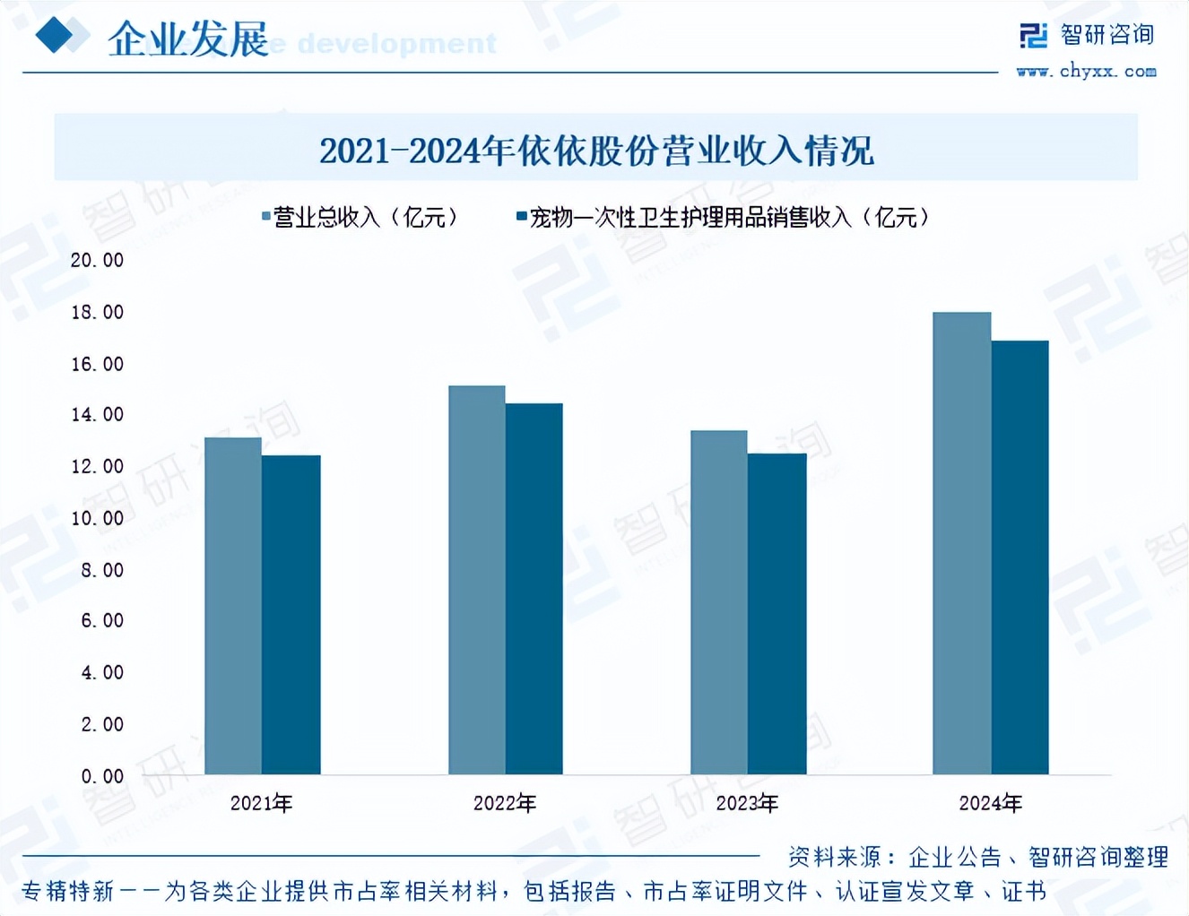 天津市依依卫生用品股份有限公司成立于1990年,于2021年5月18日在深圳证券交易所主板成功挂牌上市,股票简称“依依股份”。依依股份是国内卓越的卫生护理用品生产商之一,主要从事一次性卫生护理用品及无纺布的研发、生产和销售,其中,一次性卫生护理用品包括宠物卫生护理用品和个人卫生护理用品,其中,宠物卫生护理用品包括宠物垫、宠物尿裤、宠物清洁袋、宠物湿巾、宠物垃圾袋等,远销美国、日本、意大利、英国、巴西、韩国等近40个国家和地区。数据显示,2024年,依依股份营业总收入为17.98亿元,同比增长34.41%;其中,宠物一次性卫生护理用品销售收入为16.9亿元,同比增长34.93%。