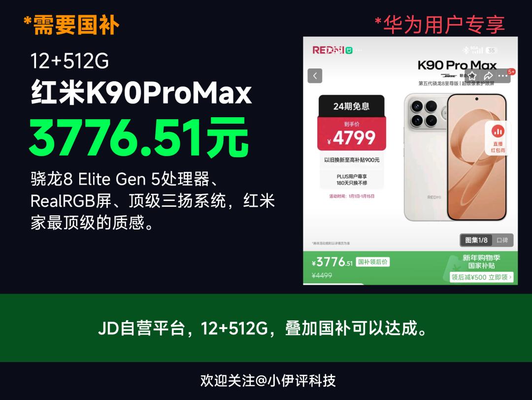 目前红米K90ProMax的12+512G在官方自营平台也是有200块钱的优惠的,叠加国补后,可以做到3776.51元。