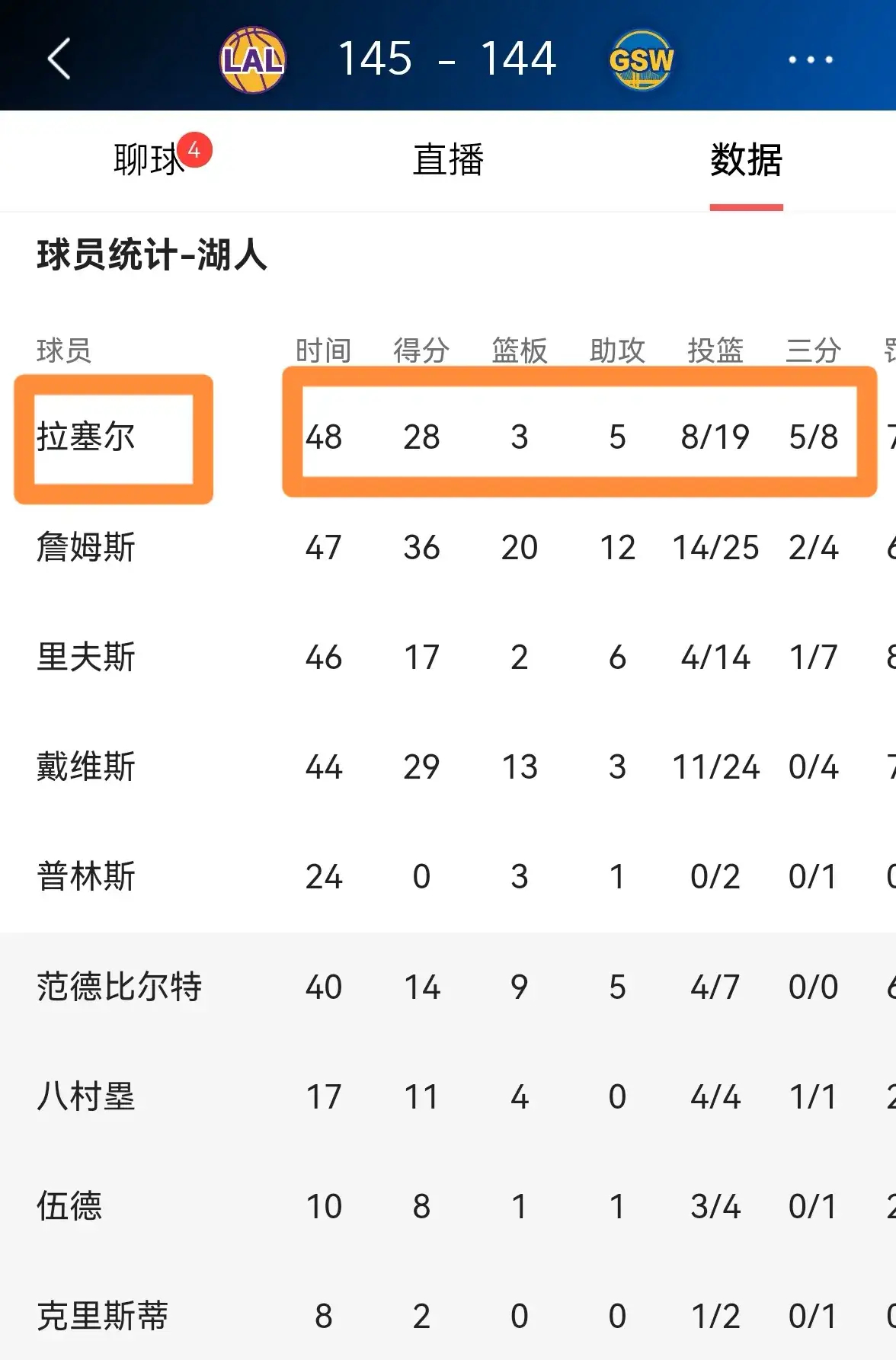 湖人在客场历经双加时艰难的以145:144险胜勇士,当比赛终场哨声响起的那一刻,异常兴奋的湖人球员拉塞尔直接一脚把篮球踢向了空中。此役,拉塞尔的表现同样非常出色,首发出战48分钟,砍下28分3篮板5助攻,非常好的完成了自己的任务。
