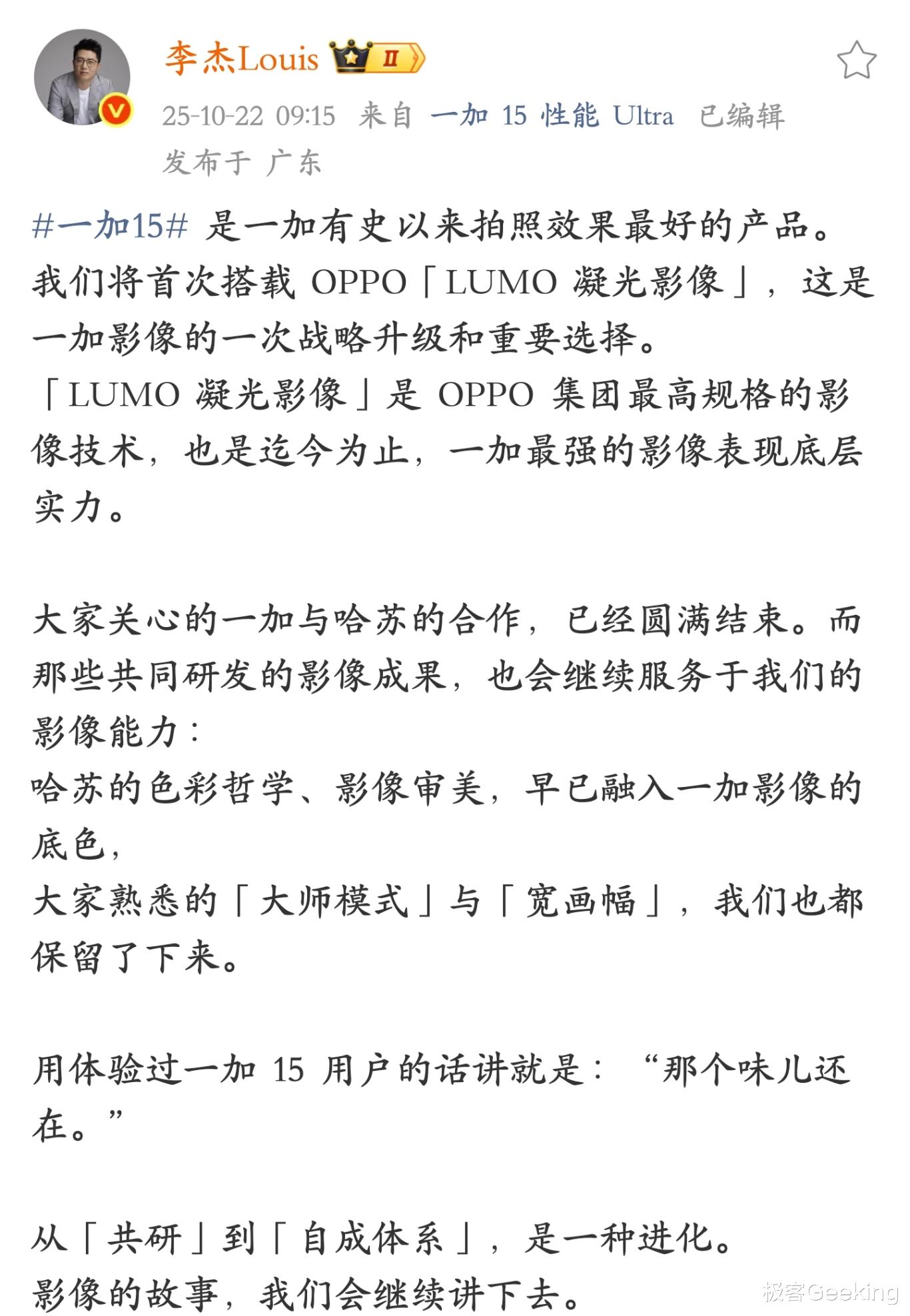 一加由此迎来影像战略升级,同时那些和哈苏共同研发的成果,也会继续融合到一加的影像算法中,官方宣称一加 15 是一加有史以来拍照效果最好的产品。