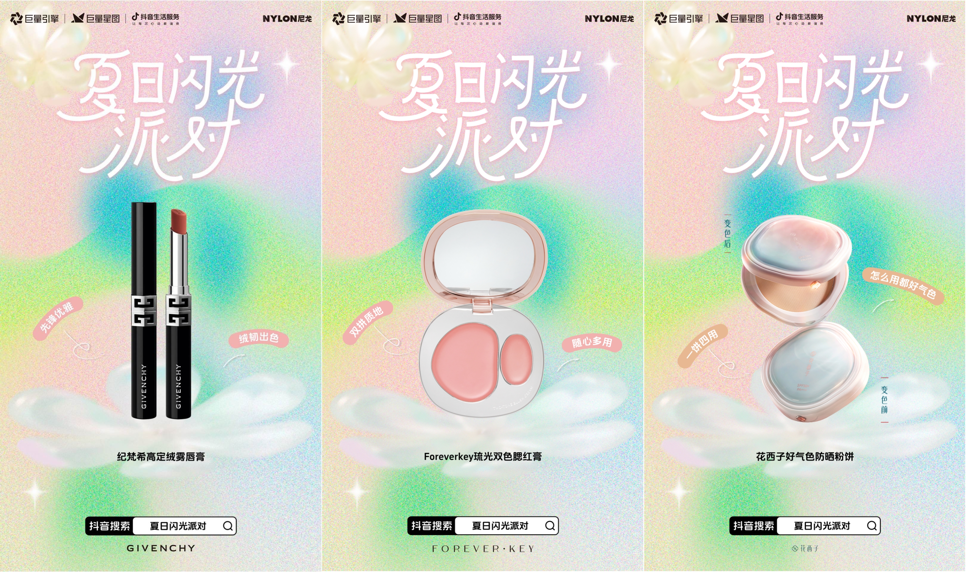 基于抖音平台潮流趋势风口的优势,「夏日闪光派对」IP携手栩栩华生集团下时尚媒体《NYLON尼龙》与纪梵希、FOREVERKEY、毛戈平、花西子等22家美妆品牌,共同发布2025年夏季彩妆新趋势,以一支趋势大片开启了“夏日闪光派对”的序幕。视频中发布的“自带星星眼妆”“精神逃逸妆”“日落橘子海妆”等热门妆容趋势,高度契合夏日度假、放松的情绪氛围,模特通过妆容变换,从油画中静态的戴珍珠耳环少女变身为不同场景中的多巴胺色闪光女孩,巧妙地表现出妆容与情绪之间的关联,让妆随心动具象化。