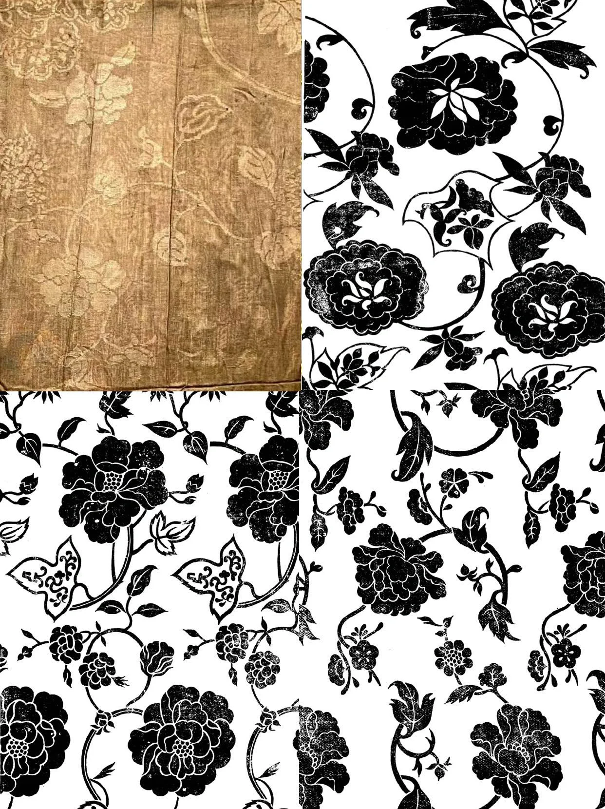 褙子衣身面料、缘边刺绣面料、内裙面料用的是定织定染的非遗工艺苏罗。服装面料纹样设计的都是宋代风格的花卉纹织造。特意邀请苏州吴罗织造技艺非遗传承人朱立群老师监工,定织。北京服装学院染色老师张承来教授亲自染色。