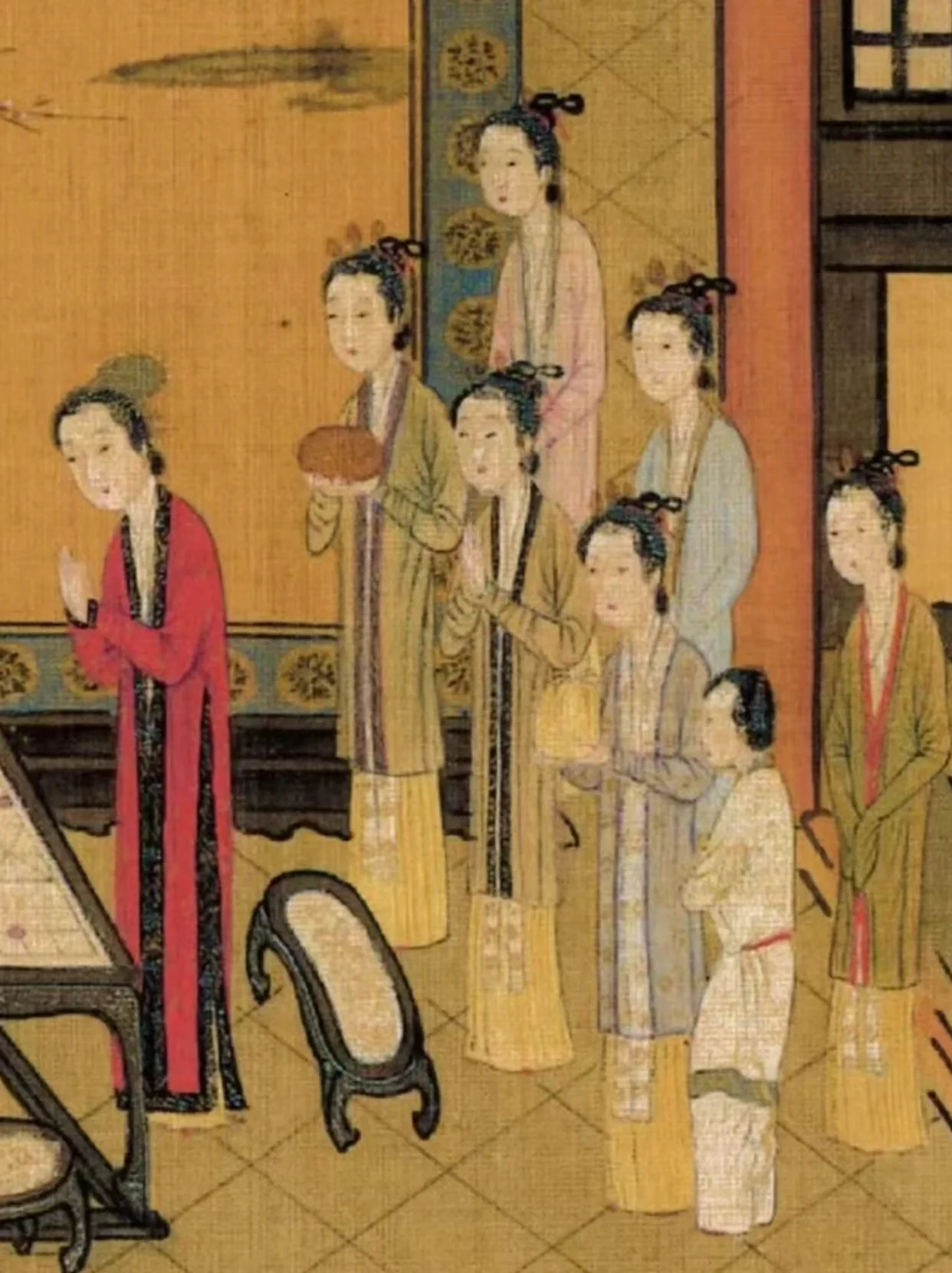 宋人喜爱叠穿,这套造型的服装层次分为抹胸、衫、褙子、裙,和外裙。