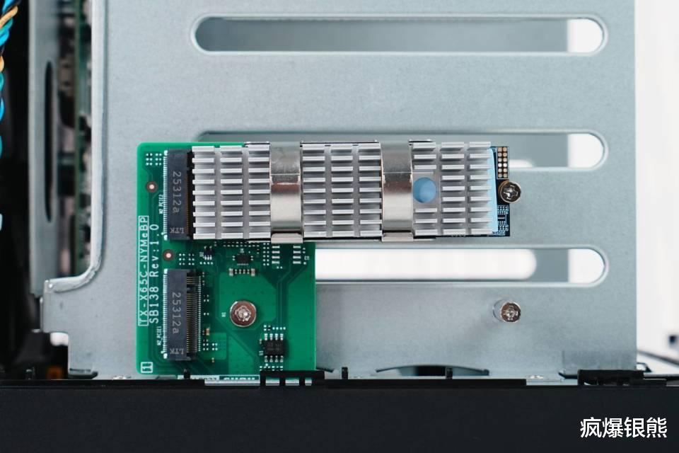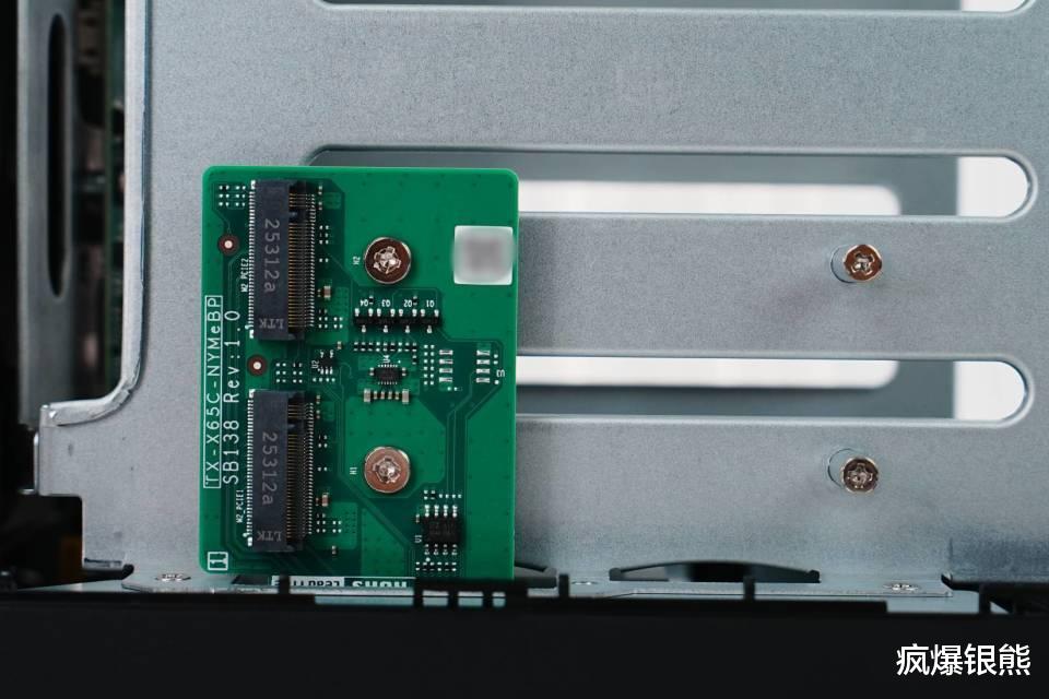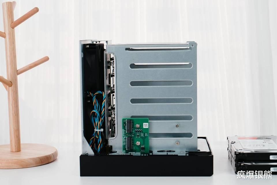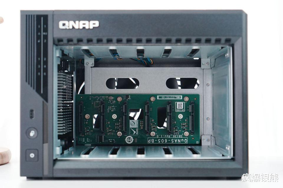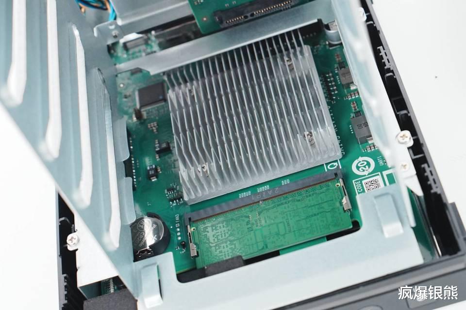 Qu605的主板设计在了NAS左侧,其中处理器上覆盖了大面积被动散热鳍片,相较于上一代旗舰扩了一大圈,再搭配硕大的风扇,整机散热效果非常有保障。内存安装位设计在近处理器左侧,装好硬盘后两者处于同一风道,这与我们常见的台式机主板设计类似,能获得不错的散热效果。