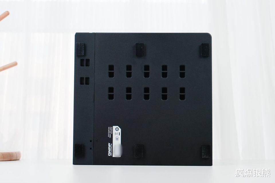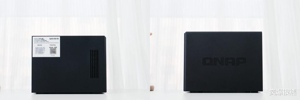 Qu605侧面设计如上图,左侧是散热孔,右上方是配置参数,其中有个安装二维码,手机扫码即可开启一键安装,非常的方便。右侧面是QNAP的品牌LOGO,虽然箱体是塑料材质,但金属质感处理工艺让其更具高级感。