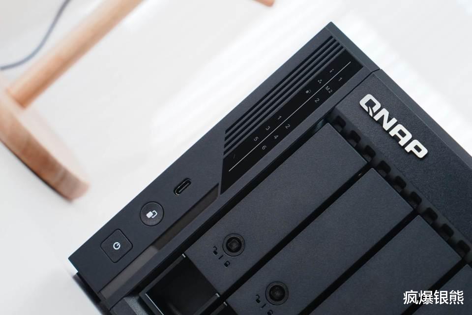 产品设计上,威联通Qu605保持了Qu系列的最新设计元素,正面左侧是功能区,内部为主板位。右侧是硬盘安装区,顶部QNAP字样采用斜切金属纹理,灯光照射下精致感十足。整机设计虽然偏商务风,但在细节上提升不少。165 × 226 × 217 mm的尺寸和2.52kg的重量,对于一个六盘位NAS而言还是蛮小巧的。