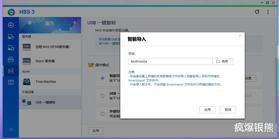 官方一共提供了两种复制模式,其中智能导入只需我们设置好目标文件夹就可以。随后只要插入外接USB设备,点击一键复制按钮,就会自动把USB设备中的内容复制到指定文件夹中,而且系统会自动识别新旧文件,NAS中已经存在的内容是不会自动复制的。
