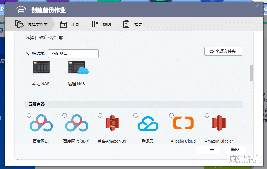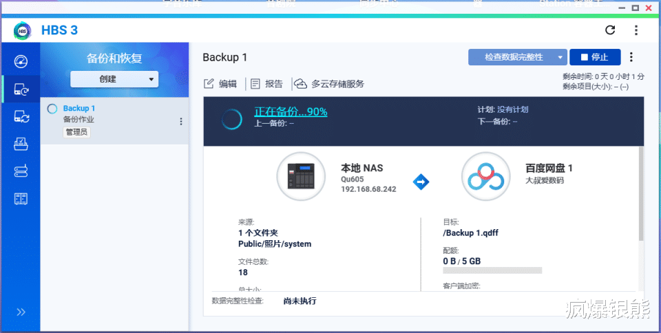 而且网盘的设置也非常简单,点击创建,然后选择百度网盘,输入账号和密码,即绑定了百度网盘,之后选择NAS中的重要数据,就可以将其备份到云端了。恢复数据和备份数据基本一致,也很简单,这里就不赘述了。
