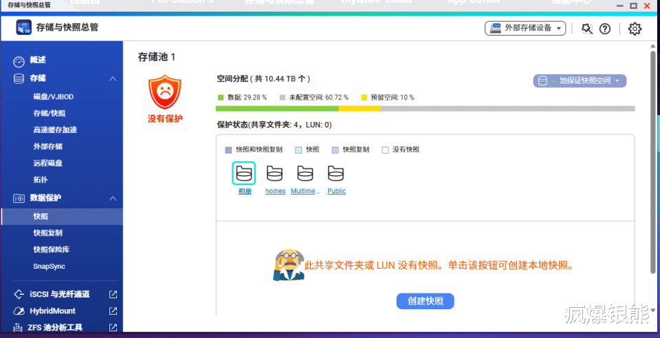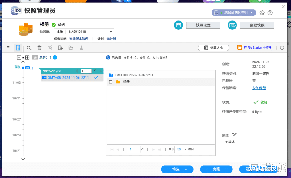 快照功能是威联通QuTS Hero系统的另一大优点,其作用类似于Windows 的时间节点还原功能,在我们不小心将NAS中重要数据误删后,通过快照功能就可以将其迅速恢复至原来状态。