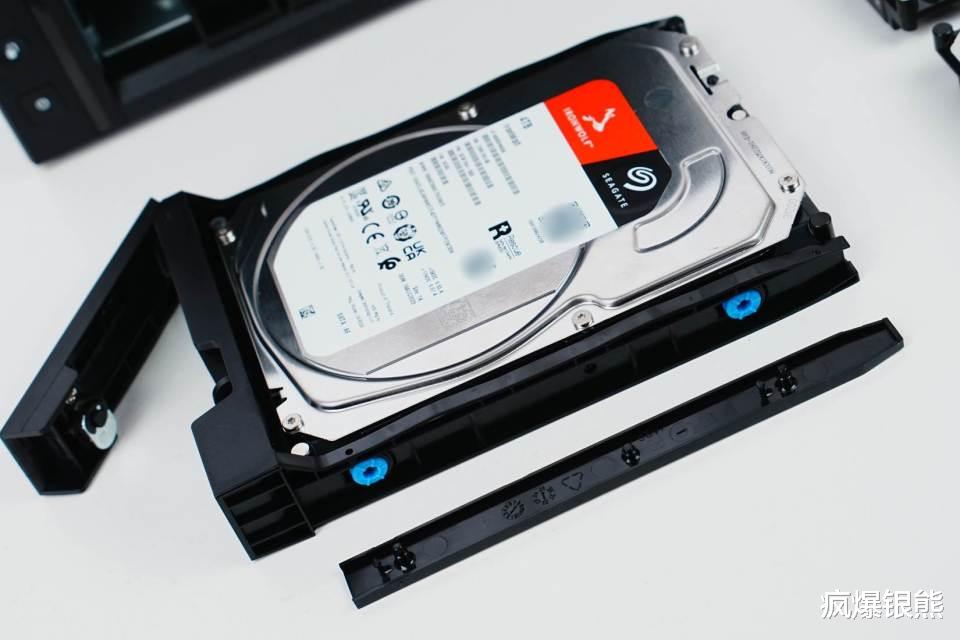 威联通的硬盘架保持了经典的设计,左右两侧为快速固定条,拆下后放入3.5英寸硬盘然后对准蓝色小孔安装上无需螺丝就能把硬盘牢牢地固定在硬盘架上,使用起来非常的方便。