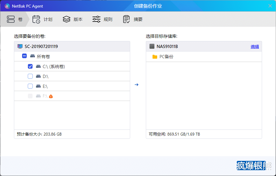 之后在NetBak PC Agent客户端左侧选择要备份Windows系统盘(也可以自己选择备份某个卷)右侧选择存放到NAS中哪个位置,备份时间,之后按提示设置一下计划任务和版本控制就可以了。