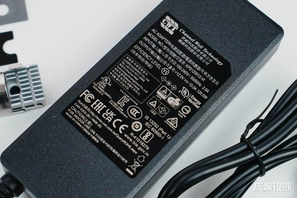 电源适配器采用100-240v宽电压设计,输出功率为12V10A(120W)。