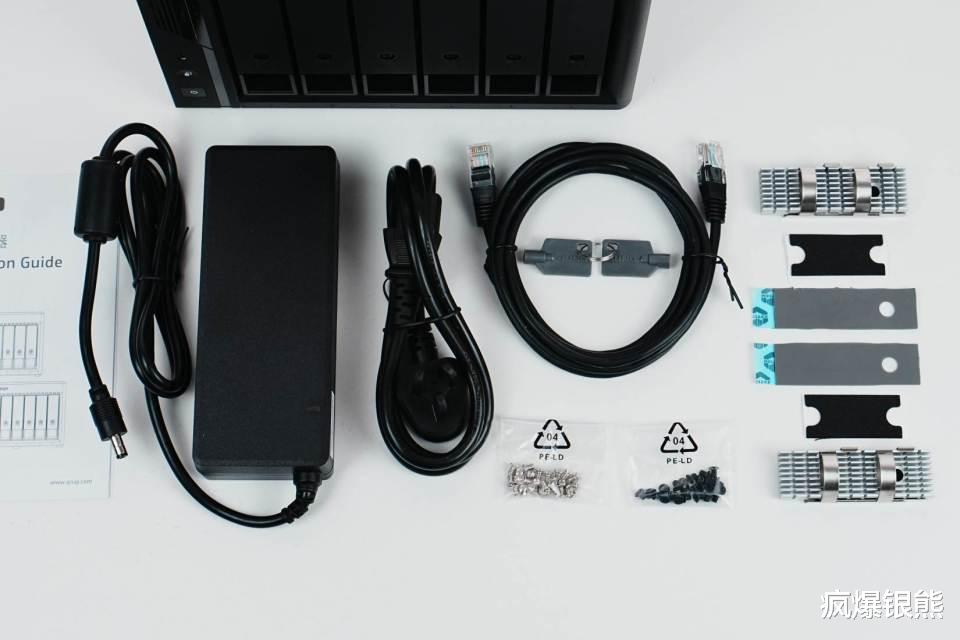 箱子里面除了NAS本体外,所有配件如上图,有电源适配器和电源线一套,六类网线一根、SSD金属散热片(含减震垫和导热硅脂垫)两套、硬盘钥匙2个,说明书、保修卡,2.5英寸和3.5英寸硬盘固定螺丝各一袋。