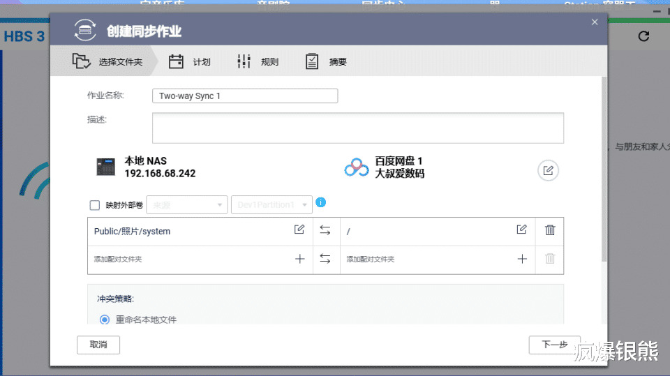 其中双向同步是本地NAS和网盘数据保持一致,完全1:1镜像,A数据源做了修改后,B随之同步修改,反之依然,是我最常用的同步方式。单向同步是本地NAS文件改变后,网盘文件不会改变,除非手动同步或设置同步计划。活动同步是网盘文件改动不影响本地NAS里的文件,除非手动开启同步任务或创建同步计划。同步的过程中支持修改作业名称,添加描述,选择文件地址,同时也有多种冲突策略可供用户调整。