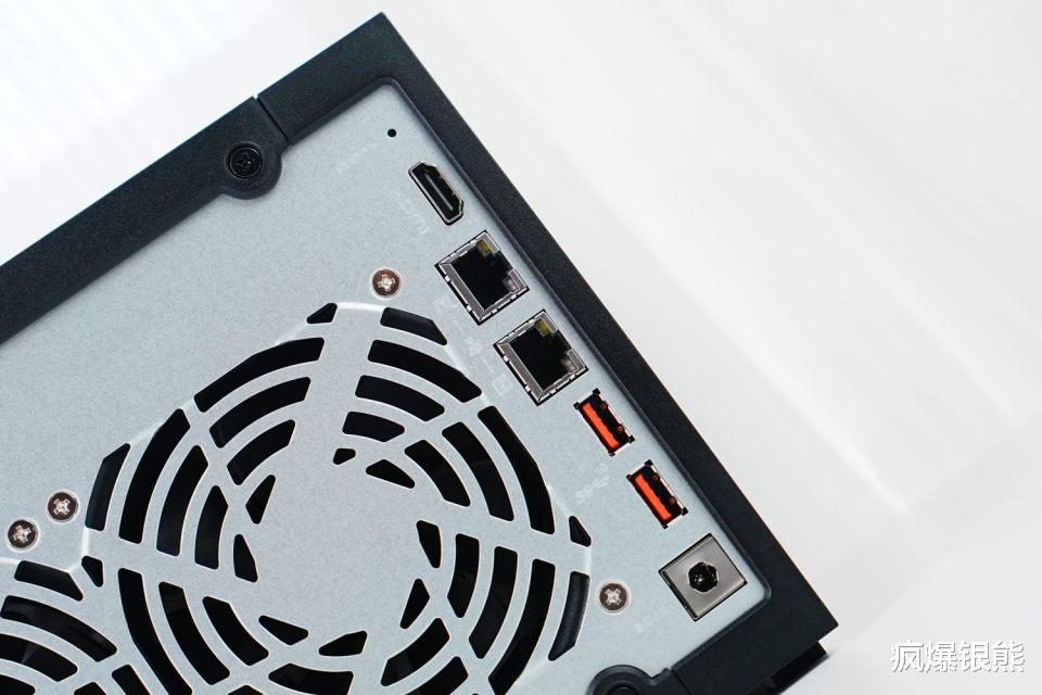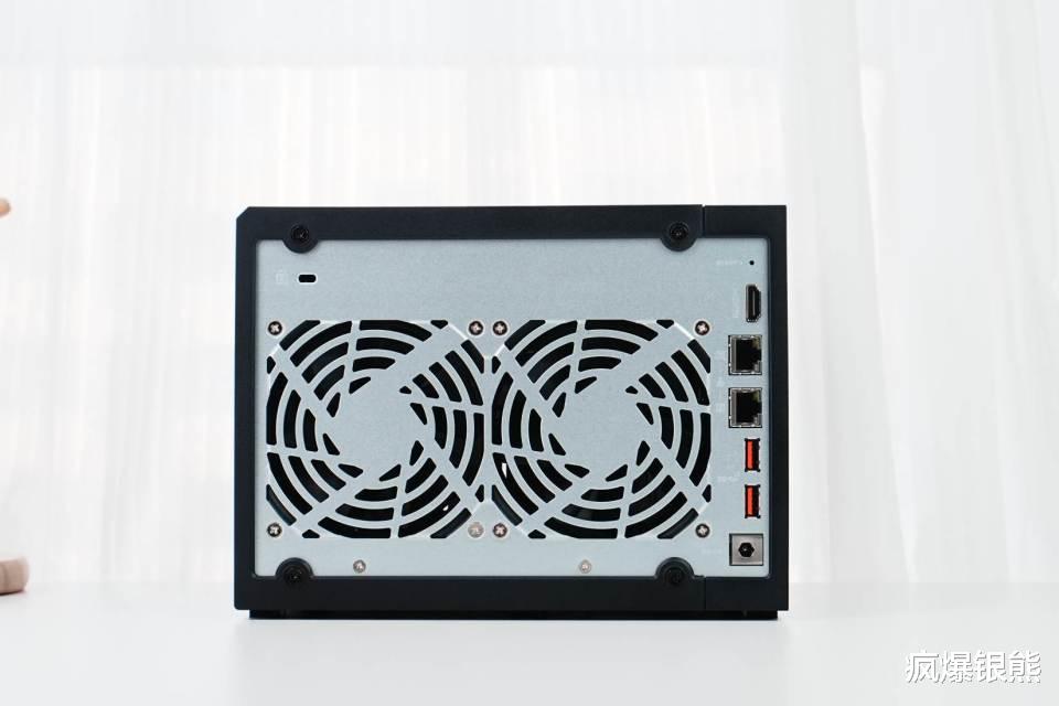 背面设计如上图,采用了双风扇设计,前面进风后面出风的直通设计,在提升散热效率上没的说,更何况还是俩风扇来保证6个硬盘工作时的稳定性。右侧一字排开是各种接口。