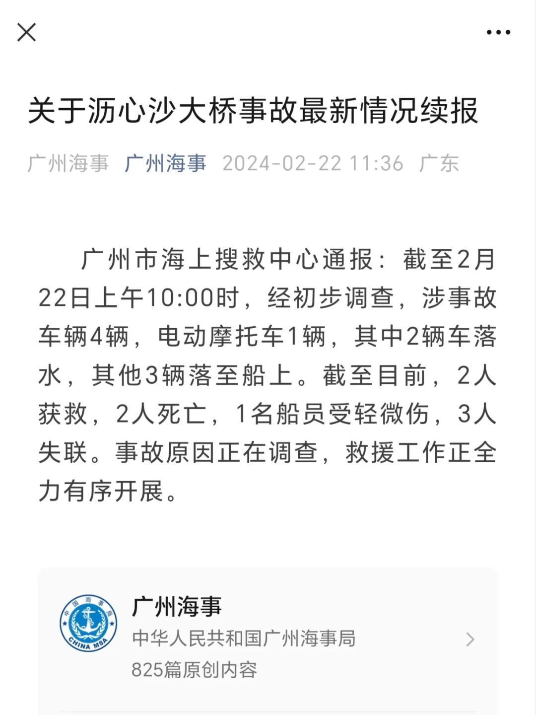 炸裂,这是什么船这么牛…… 据广州海事局最新消息,2024年2月22日05时30分左右,一艘集装箱船空载从佛山南海开往广州南沙途中,航经洪奇沥水道时触碰沥心沙大桥桥墩,致沥心沙大桥桥面断裂,事故原因和伤亡情况正在调查核实。