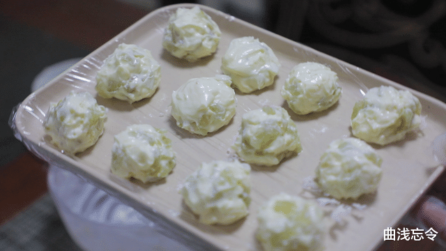 3、做馅料②:将青团奶酪均分成12份,约20g/个,团成小圆球,继续放入冰箱冷冻备用。