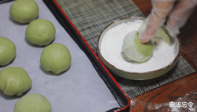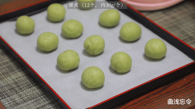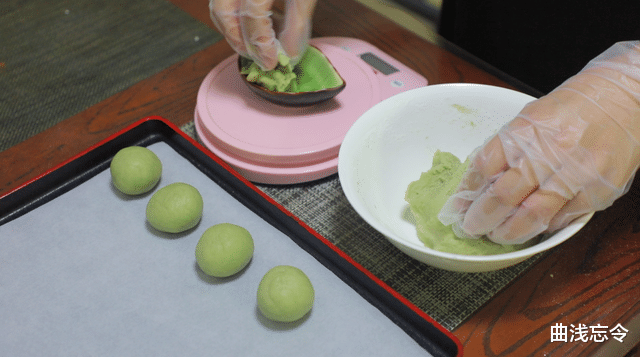 5、做冰皮②:推荐冰皮可调色成绿色,可用抹茶粉或食用色素调色。可直接调成一个绿色,或者分成几个粉团,调成深浅不同的绿色和白色做拼色。再将粉团均分为12个,约30g/个。
