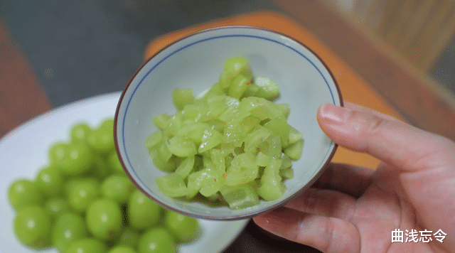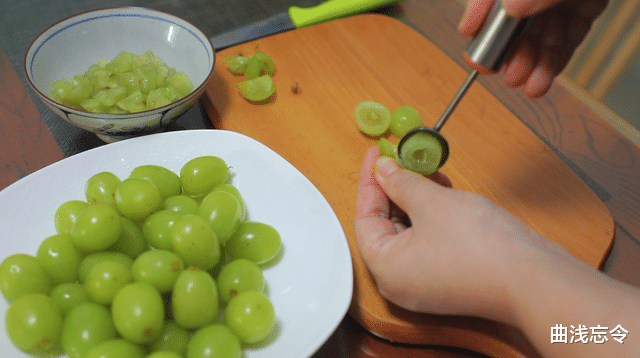 1、处理青提:青提提前清洗干净滤干水分,对半切开,用勺子挖出果肉,果皮不要,切成小丁备用。