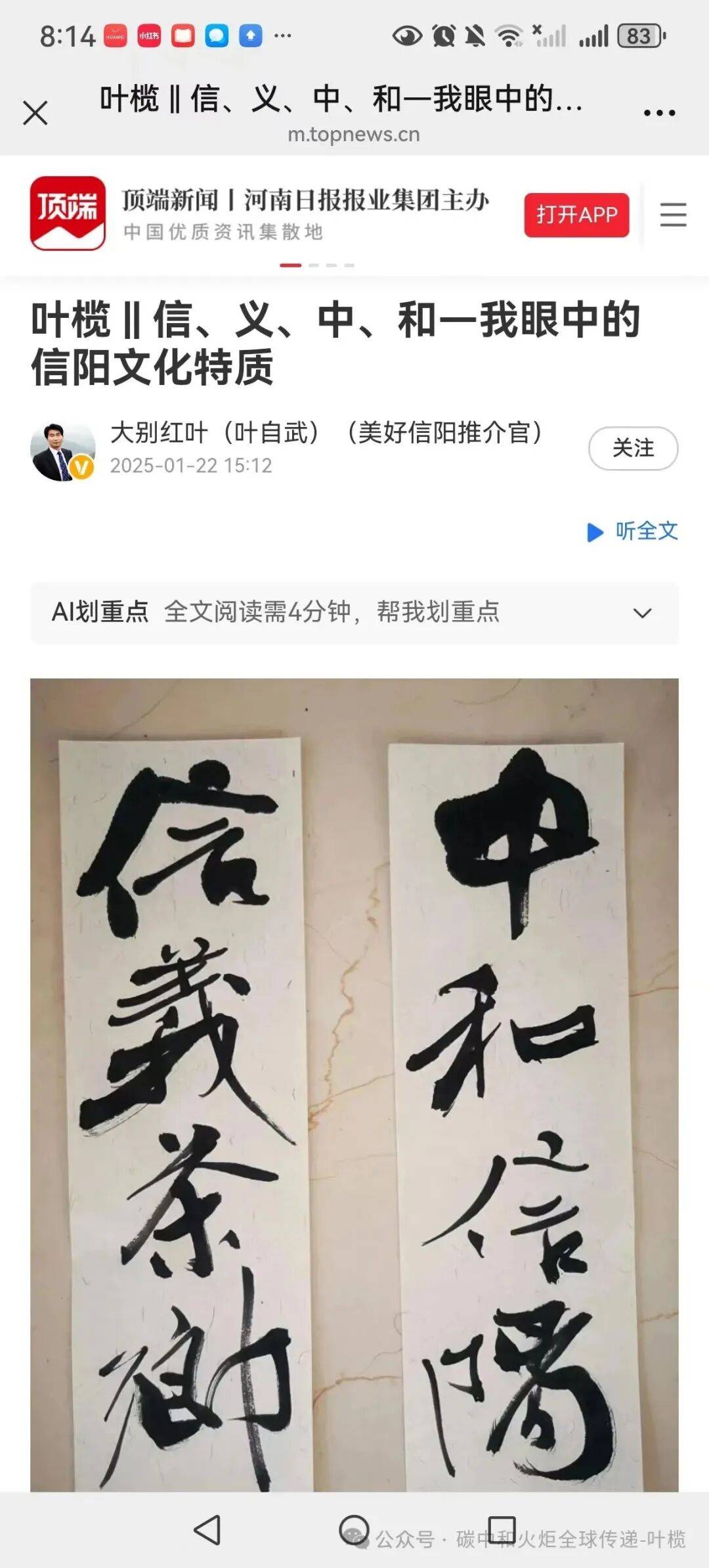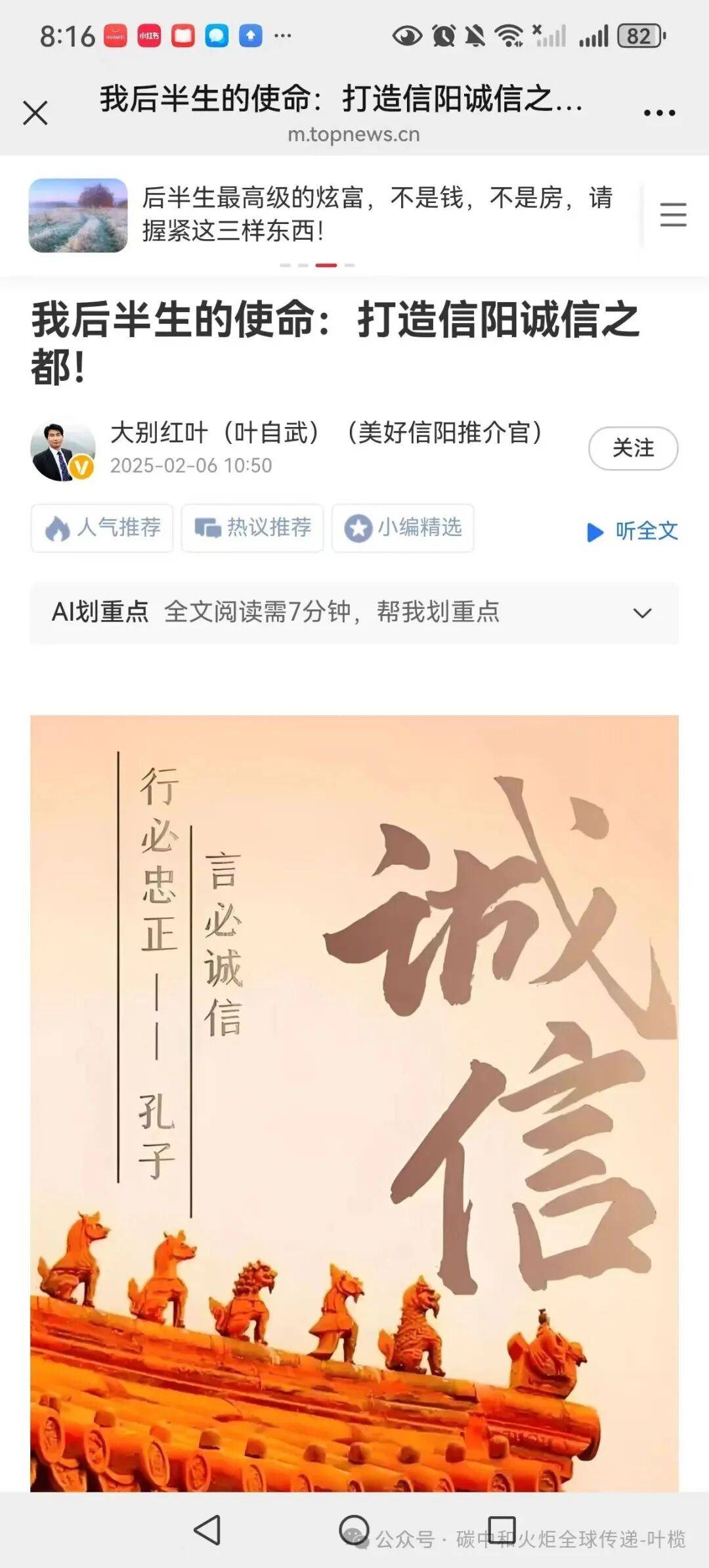 (AI的水平太强大了,我输入“打造信阳诚信之都叶榄”这几个关键词,AI豆包在数秒钟之内,就洋洋洒洒写了2000言,逻辑性之强,令人吃惊!把我一年来以民间力量推动“打造信阳诚信之都”的各种活动概括得清清楚楚,条分缕析,减少了我很多码字的辛苦。科技的发展,令人咋舌!——叶榄,2025年12月4日于光明之州.潢川)