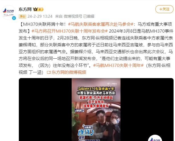 2024年3月8日是马航MH370事件发生十周年的日子。据东方网报道,2月28日晚,记者连线失联乘客中方家属代表姜辉得知,部分失联乘客中方的家属将于近日前往马来西亚吉隆坡,参与由马来西亚方面组织的家属通气会。据姜辉介绍,马来西亚交通部长也会出席此次会议,马方将在会议后的同一场地召开新闻发布会,“是他们主动提出来的,可能有重大事项发布,(因为)往年没有这个环节”。