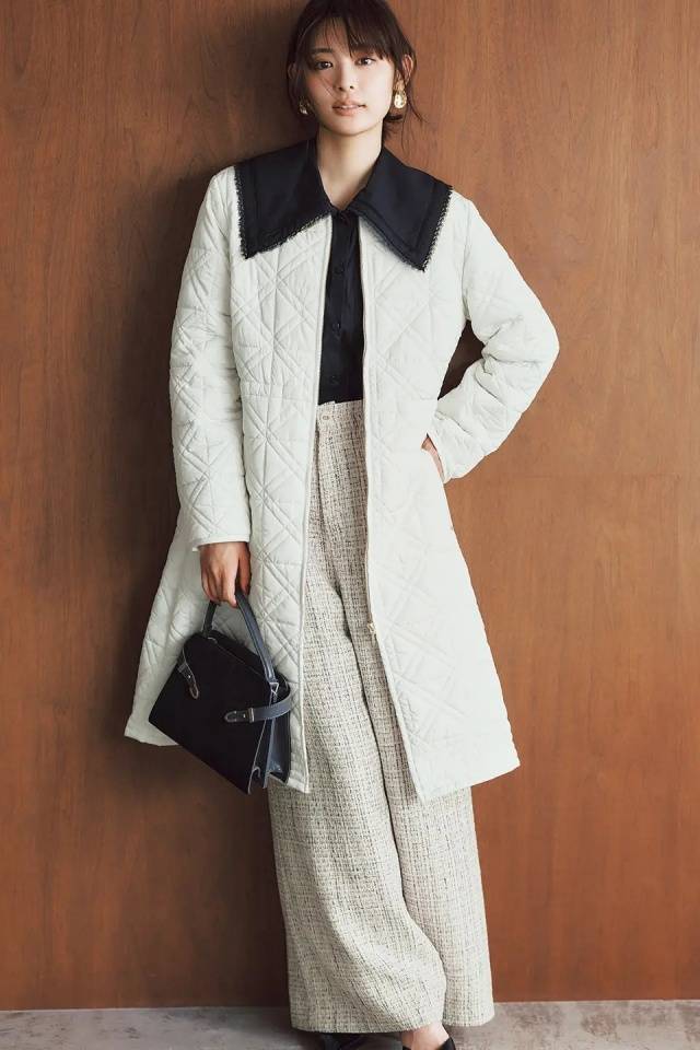 将容易显得运动风的中棉绗缝外套,通过搭配菱形花纹与直线剪裁,焕发现代时尚气息。灰米色款采用黑色滚边的双色设计,呈现清新风貌。收紧背后腰部的抽绳,即刻切换为轮廓分明的利落造型!