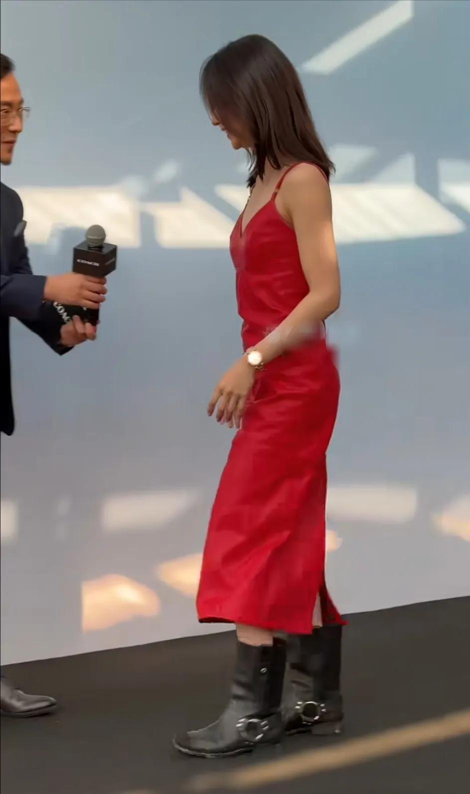 吴谨言今日线下活动,一袭红色吊带裙配上靴子穿搭感觉有点奇怪呀,上半身其实挺好看,